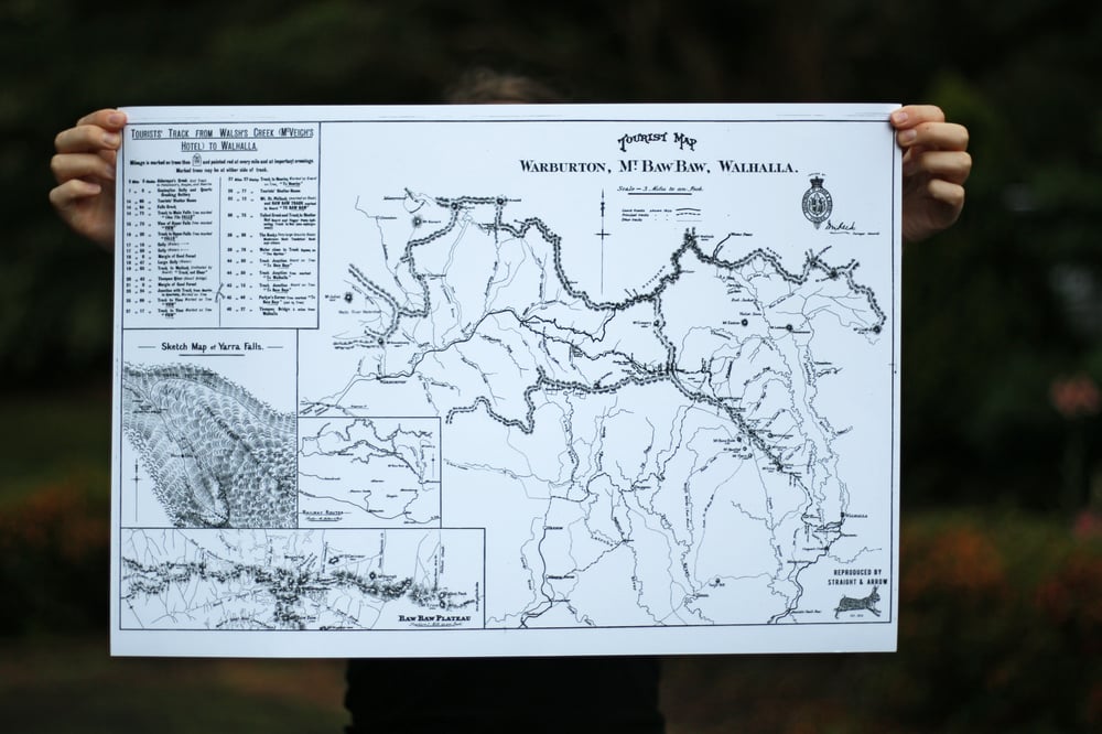 A detailed reproduction of a tourist map showing the trails from Warburton to Walhalla via Mt Baw Baw dated 1907. This map has been edited and tidied up to remove some of its imperfections to give it a cleaner finish and make it easier to read, making the locations along the trail now legible. Digitally printed on A2-sized, 160gsm coated paper.