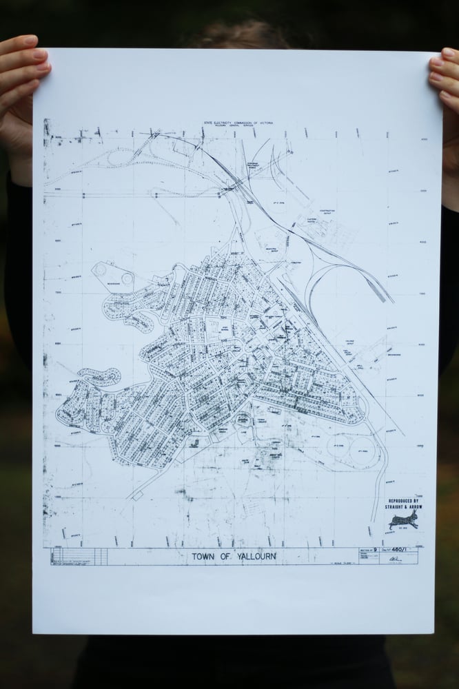 A detailed reproduction of a town planning map of Yallourn dated 1968. Pulled from the archives, this map has been edited and tidied up to remove some of the imperfections that had accumulated on the 50 year old plans to make all of the streets and house numbers much easier to read. Digitally printed on A2-sized, 160gsm coated paper.